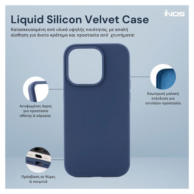 Ανακάλυψε τη νέα σειρά θηκών Liquid Silicon Velvet από την inos, σχεδιασμένη για να συνδυάζει αξεπέραστη ανθεκτικότητα με πολυτελή αισθητική και απαράμιλλη υφή! Αυτή η μοναδική θήκη, με την εξωτερική της επιφάνεια από εξαιρετικά ανθεκτική σιλικόνη, προσφέρει μια απαλή, μεταξένια αίσθηση και σταθερό κράτημα. Στο εσωτερικό της, η επένδυση από μικροΐνες φροντίζει την προστασία της συσκευής σου, εξασφαλίζοντας πλήρη ασφάλεια από φθορές. Κάθε λεπτομέρεια είναι προσεκτικά σχεδιασμένη, ώστε η θήκη να εφαρμόζει άψογα στο τηλέφωνό σου, χωρίς να επηρεάζει τις θύρες ή τα πλήκτρα ελέγχου. Απόλαυσε την κομψότητα και την απόλυτη προστασία, διατηρώντας το στυλ της συσκευής σου ανέπαφο, ενώ την προστατεύεις από τις καθημερινές προκλήσεις της ζωής σου.