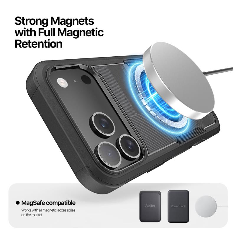 Η θήκη Dux Ducis Shld Series Umbra Pattern διαθέτει σκληρό κέλυφος διπλής στρώσης από PC και εσωτερικό πλαίσιο από TPU με εσωτερικό σχεδιασμό «αερόσακου» για απορρόφηση πτώσεων έως ~3 m. Εξοπλισμένη με 36 μαγνήτες νεοδυμίου σε δακτυλιοειδή διάταξη, υποστηρίζει φόρτιση MagSafe και στερέωση σε μαγνητικές βάσεις αυτοκινήτου. Τα υπερυψωμένα άκρα προστατεύουν την οθόνη και την κάμερα, ενώ η ματ αντιολισθητική επίστρωση αποτρέπει τα δακτυλικά αποτυπώματα και βοηθά στο καλύτερο κράτημα.