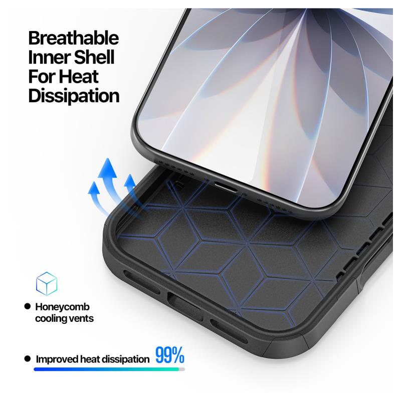 Η θήκη Dux Ducis Shld Series Umbra Pattern διαθέτει σκληρό κέλυφος διπλής στρώσης από PC και εσωτερικό πλαίσιο από TPU με εσωτερικό σχεδιασμό «αερόσακου» για απορρόφηση πτώσεων έως ~3 m. Εξοπλισμένη με 36 μαγνήτες νεοδυμίου σε δακτυλιοειδή διάταξη, υποστηρίζει φόρτιση MagSafe και στερέωση σε μαγνητικές βάσεις αυτοκινήτου. Τα υπερυψωμένα άκρα προστατεύουν την οθόνη και την κάμερα, ενώ η ματ αντιολισθητική επίστρωση αποτρέπει τα δακτυλικά αποτυπώματα και βοηθά στο καλύτερο κράτημα.
